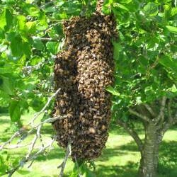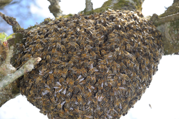 Swarming is a natural process by which bees multiply their colonies. Usually a swarm will emerge from the hive and land on a nearby branch, bush or post, or even under the eaves of a roof, where they will form a large hanging cluster of bees.