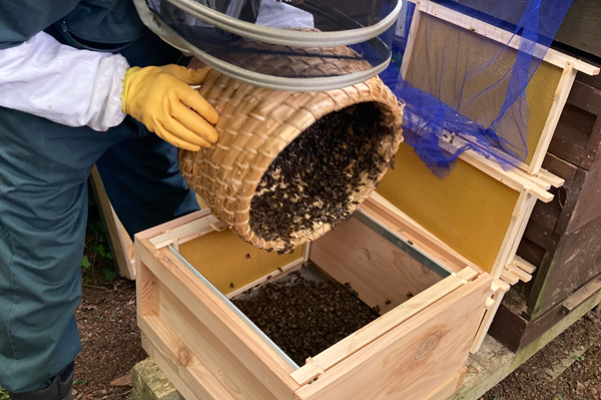 Bees will naturally climb upwards and seek a dark cavity. At first all is confusion, then they turn and head up the slope and disappear into the hive!