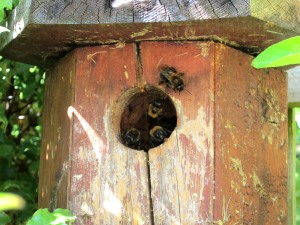 They pollinate all kinds of fruit, flowers and vegetables so, if possible, try to leave well alone.They will vacate the nest box at the end of the season.