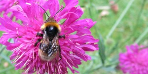 There are twenty-two species of bumble bee in the UK, usually large and furry with distinctive bands of coloured hairs. This one is the white tailed bumblebee.