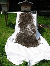 This photo shows a swarm being ‘hived’ by emptying them onto a cloth sloping up to their new front door.