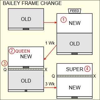 - After 3 weeks all brood in the old box will have emerged. Remove the old box and frames and recycle. Supers can be placed above the new brood box (with queen excluder).