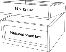 The 14 x 12 eke is a simple device which fits on top of a National brood box to provide space for 12″ high frames (see below). You can even buy a kit to convert National brood frames to 14 x 12.
