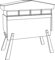 The hive holds 21 frames (14” wide x 12” deep) with an insulated dummy board front and back. The body is raised to a convenient working height on long legs and supports four or more honey-boxes above the brood chamber each holding five Manley frames or six National shallow frames (14” x 5½”).