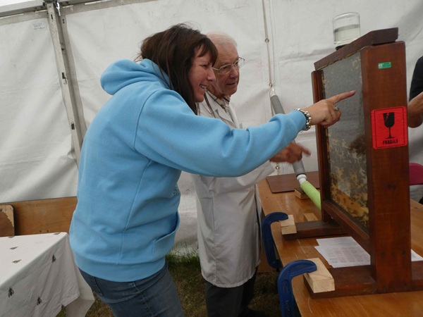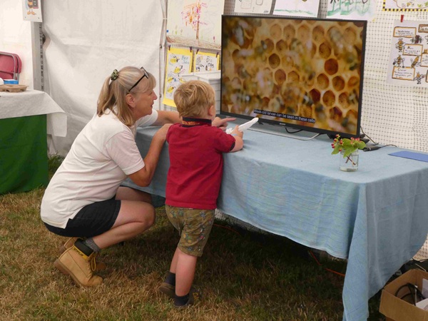 Next to ‘Taste of Honey’, the Tech team had set up a video of the inside of a live bee hive. Visitors could see all the comings and goings of the bees as if they were in there with them. The queen bee could easily be picked out, and the behaviour of the workers towards the queen, cleaning and feeding her, was very noticeable. Young children especially were fascinated to see the foraging bees do their waggle dance, telling other workers where to find flowers with lots of nectar.